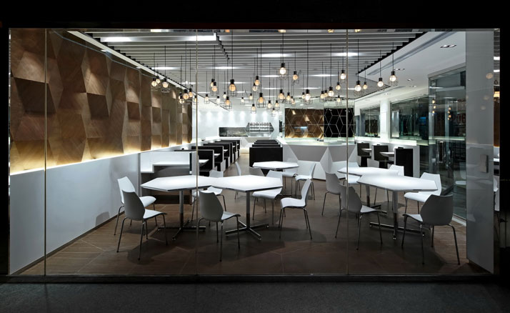卡座、圓桌、長(zhǎng)桌...座位排布靈活多變,取餐動(dòng)線科學(xué)巧妙,滿足各種規(guī)模聚會(huì)的需求。隔而不斷的石膏板材質(zhì)隔斷,以舒適為向?qū)?,墻面?dòng)感的魚(yú)群裝飾,為客人提供錯(cuò)落,更具層次感的就餐環(huán)境。